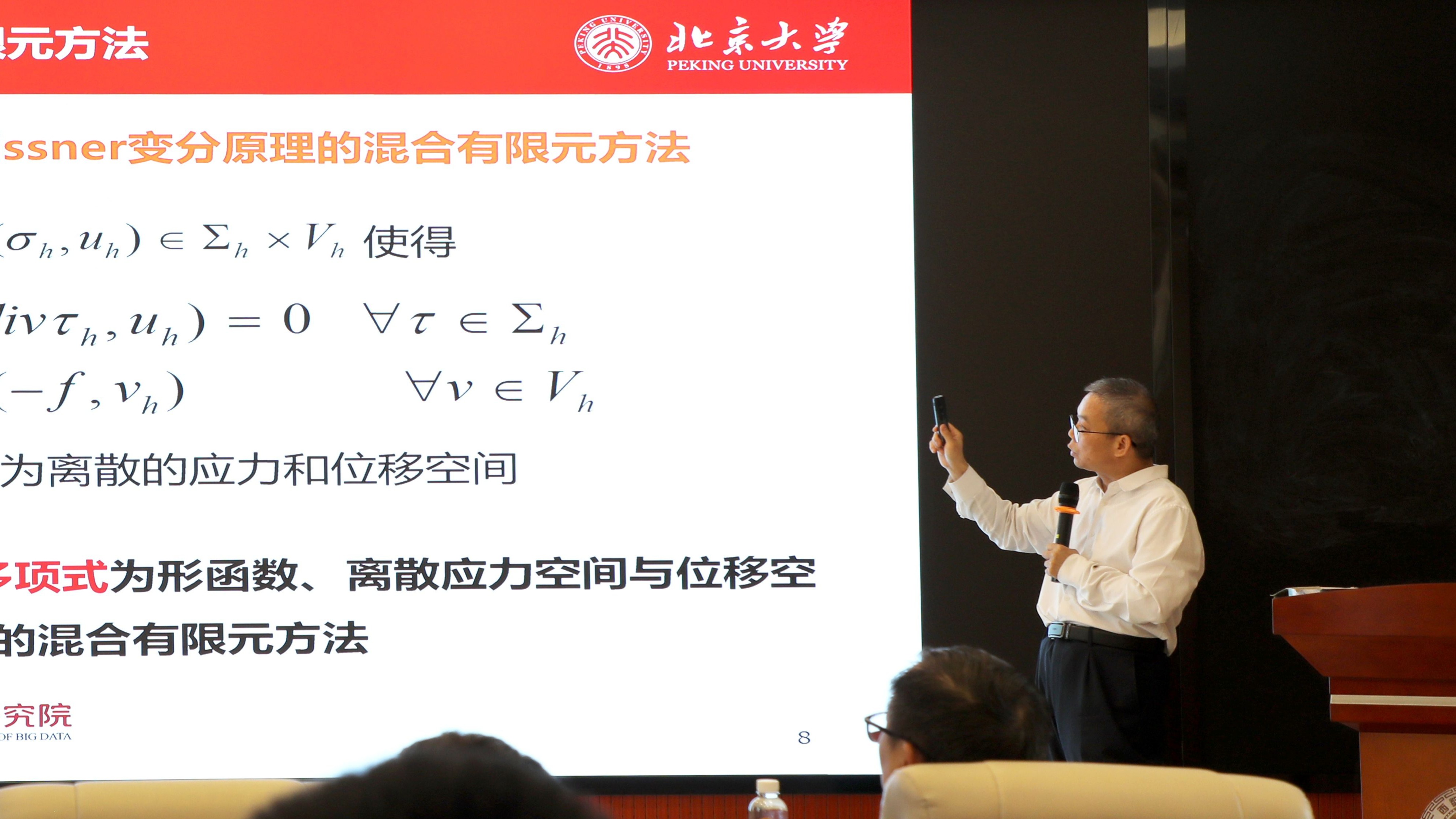 本次报告中,胡俊教授以“弹性力学问题混合有限元方法”这一数学与工程交叉领域的核心难题为切入点,系统阐述了其团队在有限元方法理论与应用中的突破性成果和最新进展。他详细阐述了其与团队最近构造的应力空间和位移空间完美匹配的弹性力学问题稳定的混合有限元方法,同时重点介绍了基于该理论研发的“北达飞易”新一代CAE算法引擎。胡俊教授通过工程案例演示,展示了该算法引擎在航空航天、土木工程等领域的高效计算能力,强调其“保结构、高精度”的技术优势,为国产算法引擎自主可控提供了有力支撑。