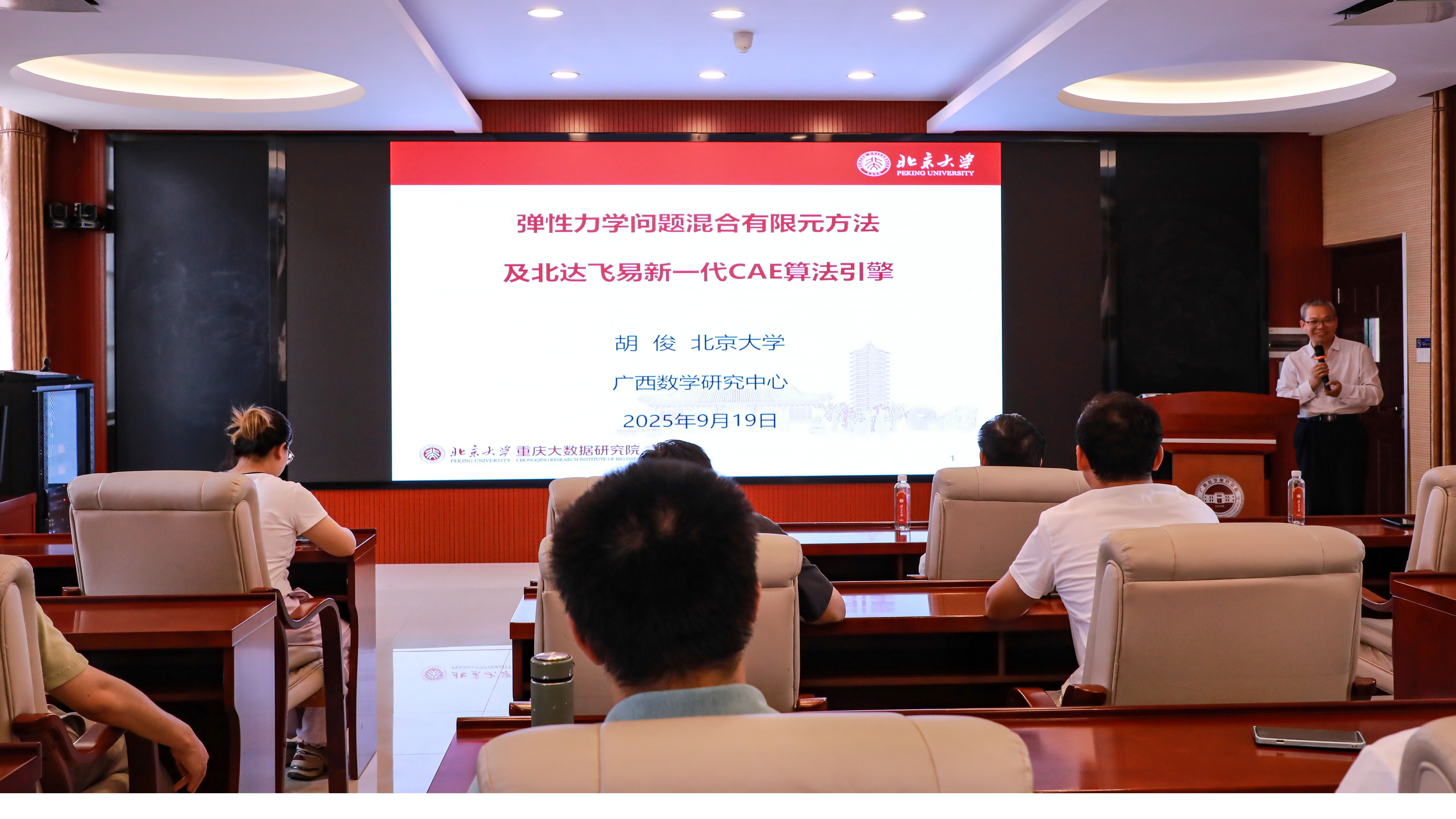 9月19日,应国家天元数学西南中心-广西基地、广西数学研究中心邀请,北京大学数学科学学院胡俊教授在广西大学广西数学研究中心W303报告厅为我院师生作题为《弹性力学问题混合有限元方法及北达飞易新一代CAE算法引擎》的学术报告。报告会由广西数学研究中心执行主任张晓教授主持。