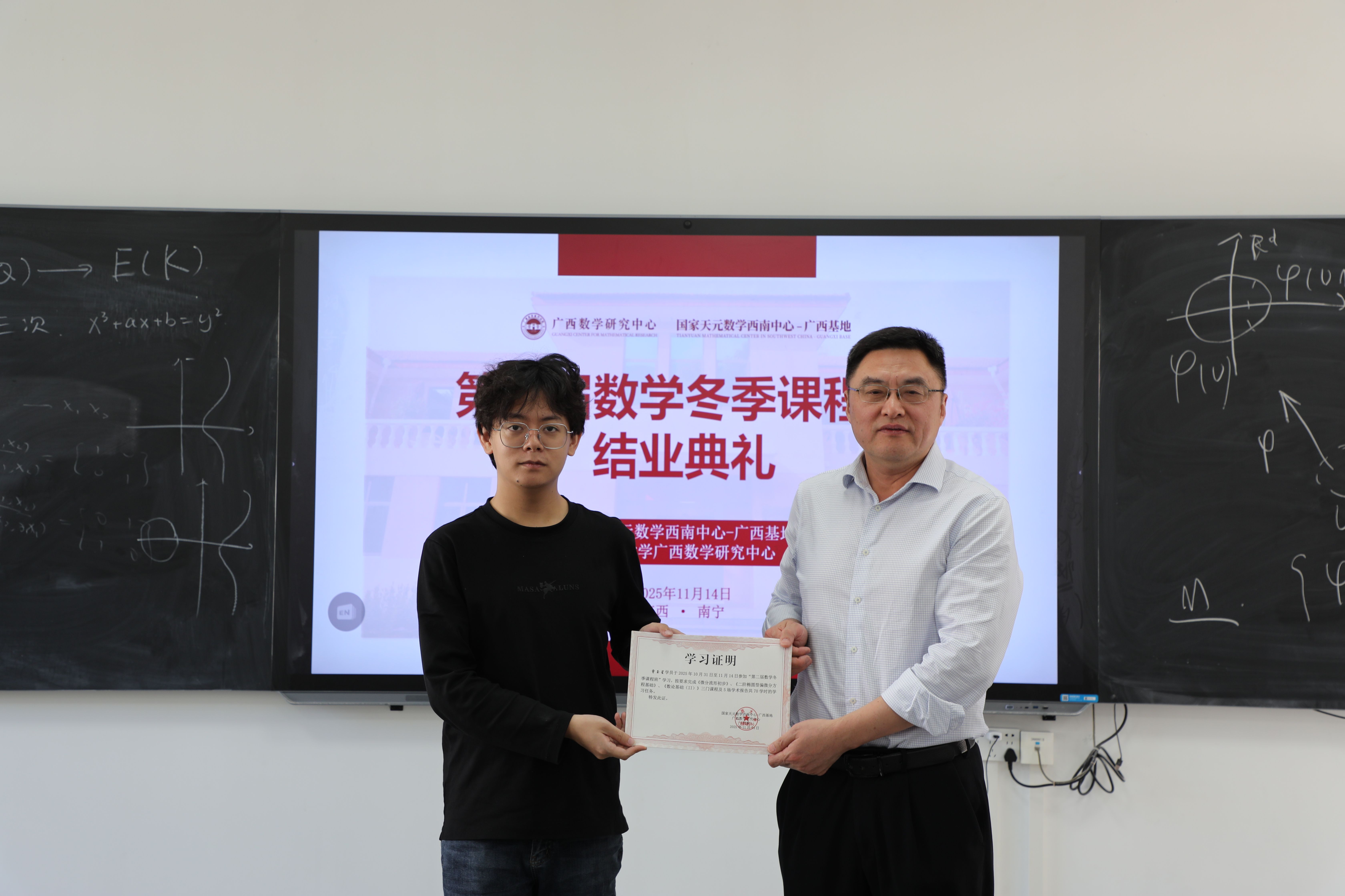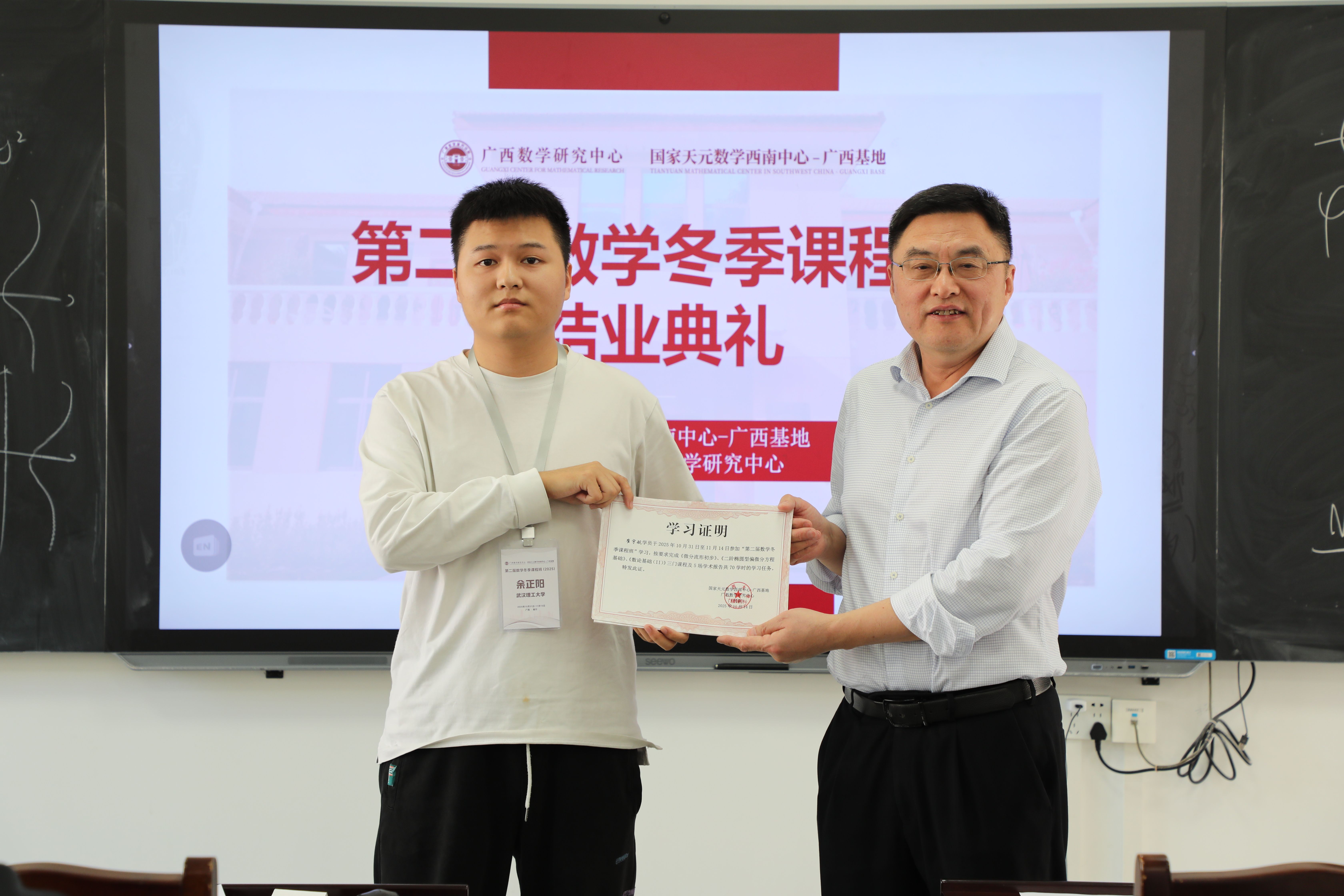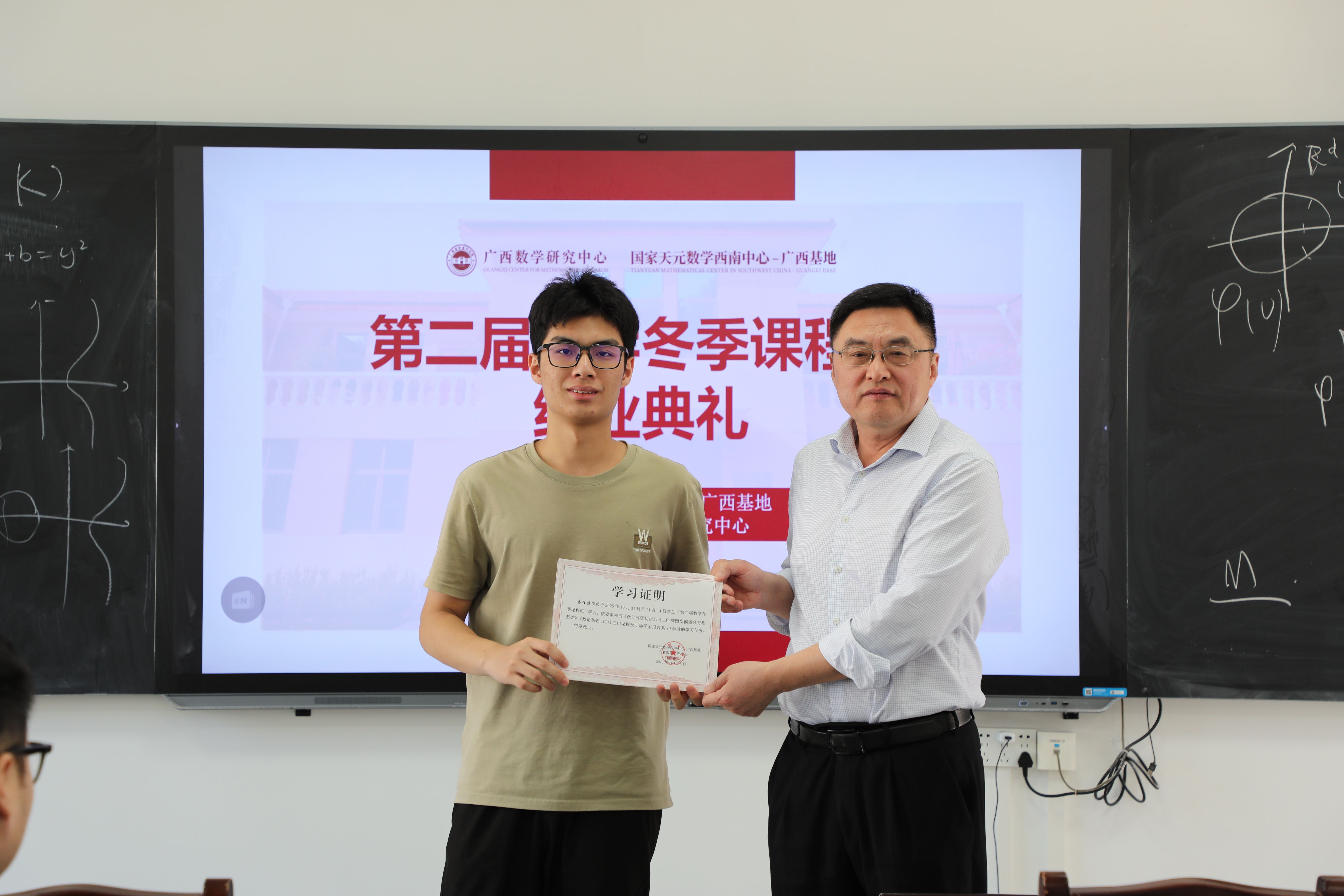 国家天元数学西南中心-广西基地、广西数学研究中心执行主任张晓教授在结业典礼作总结发言并为学员颁发学习证书。他对学员们顺利完成课程学习表示祝贺,并指出举办数学冬季系列课程班的初衷,旨在搭建高水平的学术交流平台,为学生提供更多接受一流数学家指导的机会,并希望学员们能以此为契机,深入钻研,进一步拓宽学术视野,在未来数学研究的道路上奠定坚实的基础。本次第二届数学冬季课程班在严谨而活跃的学术氛围中圆满结束。