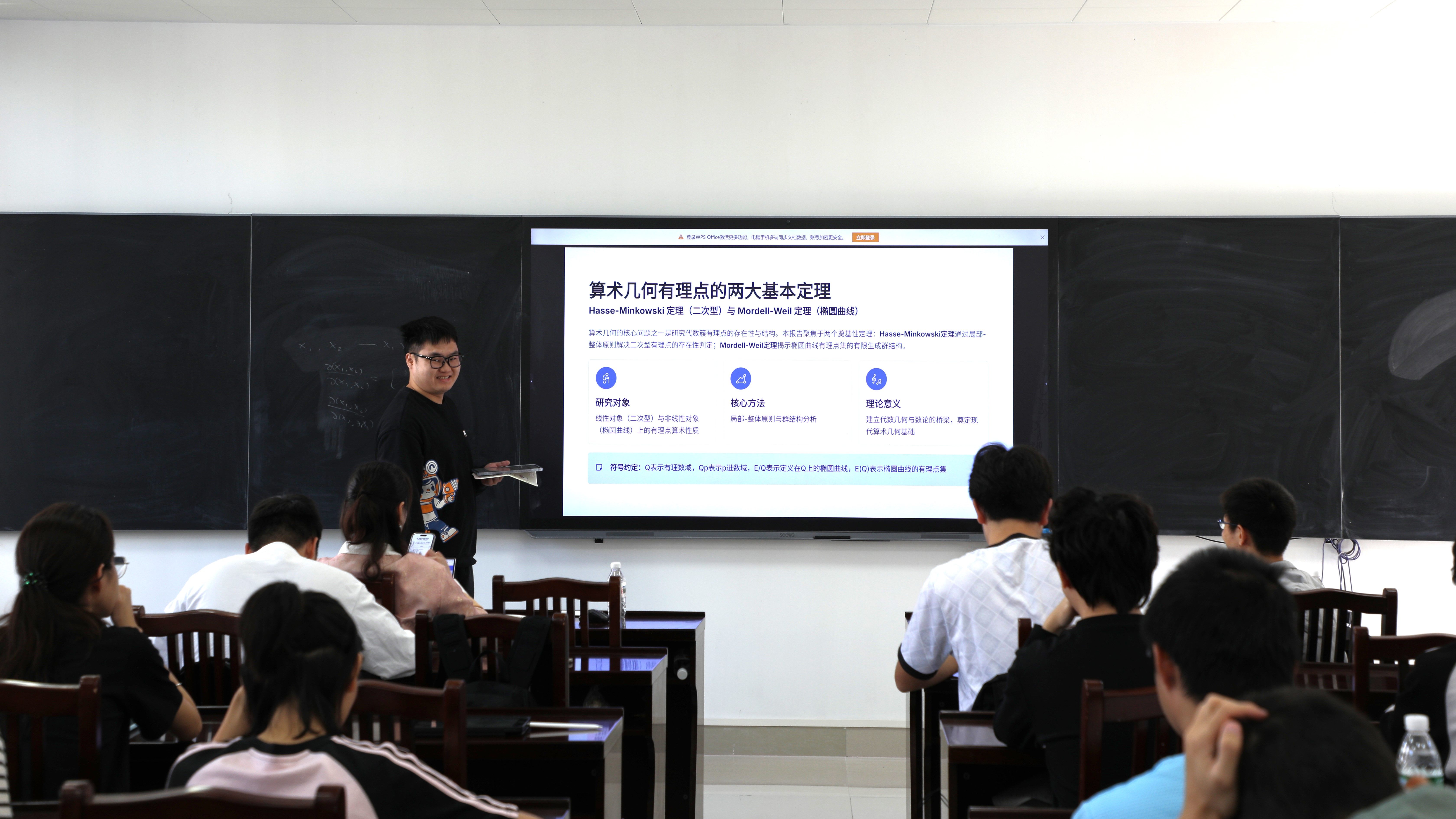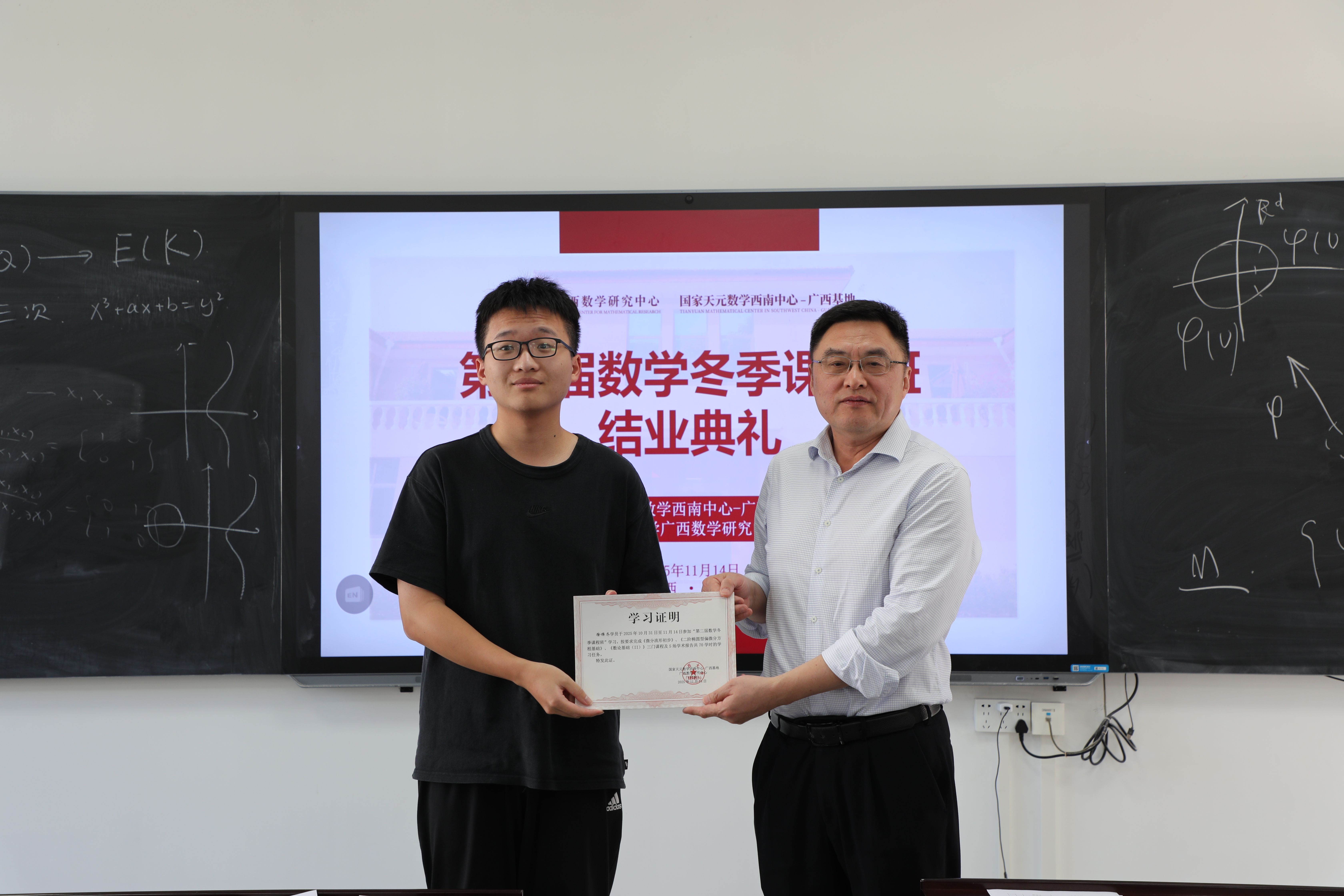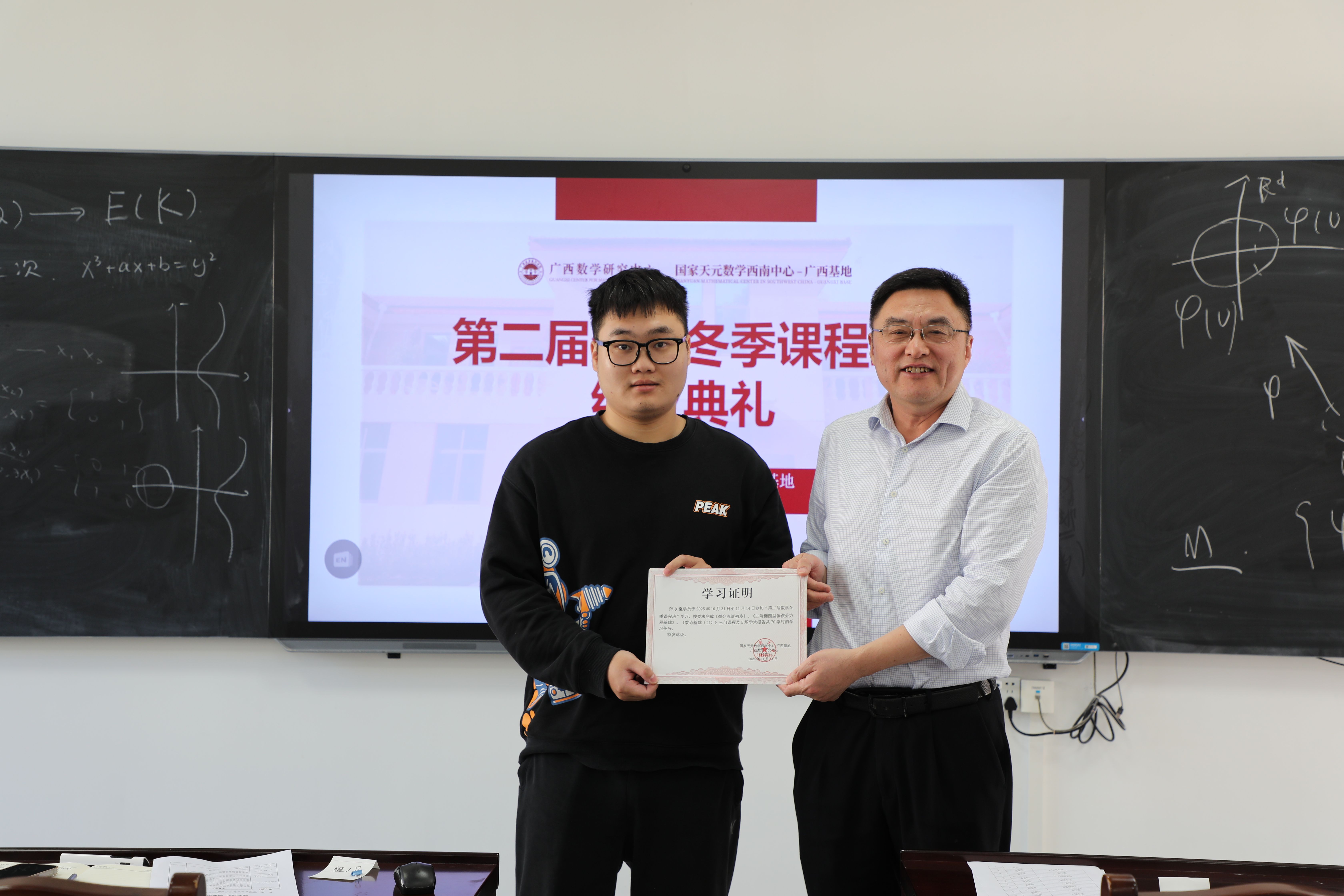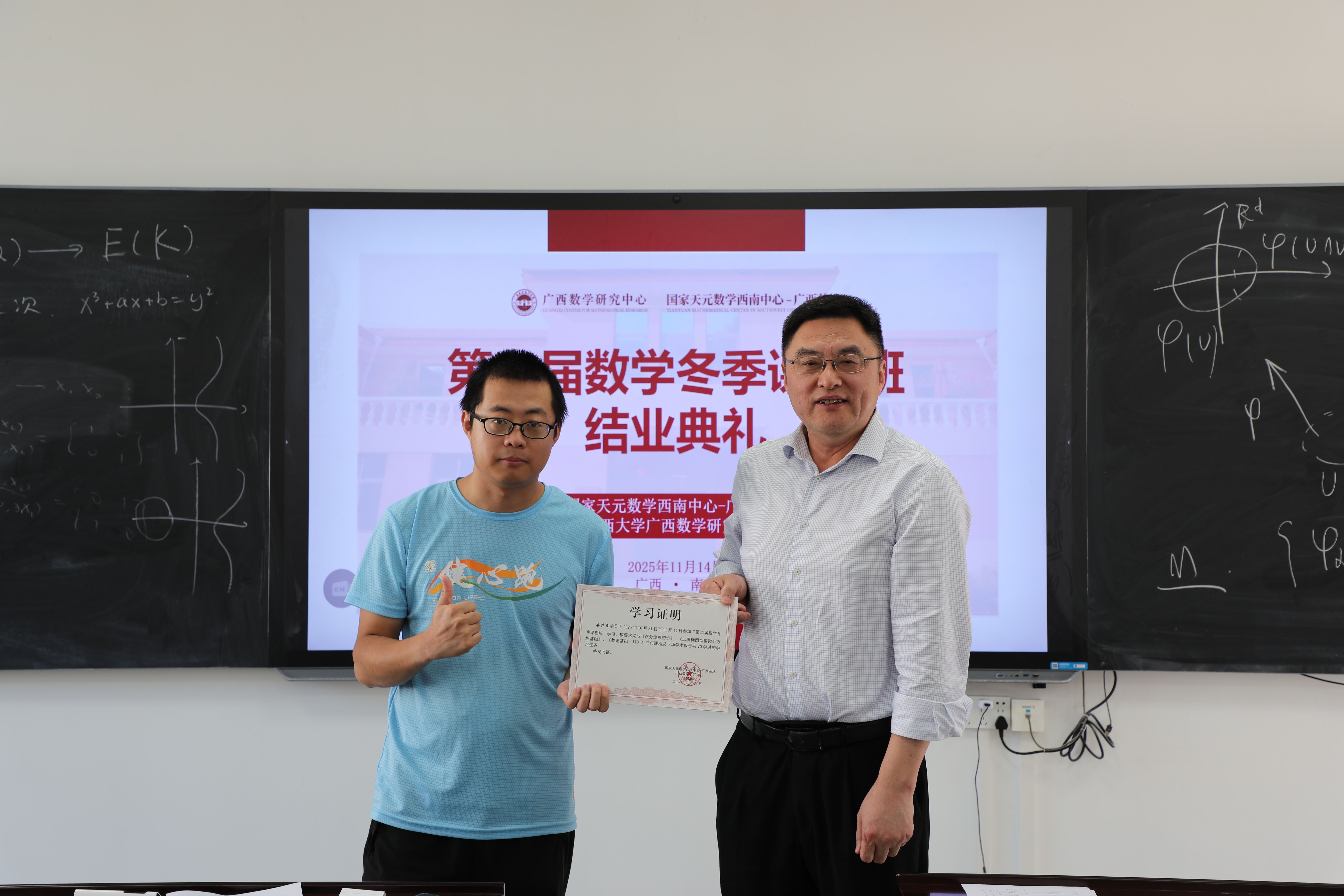 国家天元数学西南中心-广西基地、广西数学研究中心执行主任张晓教授在结业典礼作总结发言并为学员颁发学习证书。他对学员们顺利完成课程学习表示祝贺,并指出举办数学冬季系列课程班的初衷,旨在搭建高水平的学术交流平台,为学生提供更多接受一流数学家指导的机会,并希望学员们能以此为契机,深入钻研,进一步拓宽学术视野,在未来数学研究的道路上奠定坚实的基础。本次第二届数学冬季课程班在严谨而活跃的学术氛围中圆满结束。