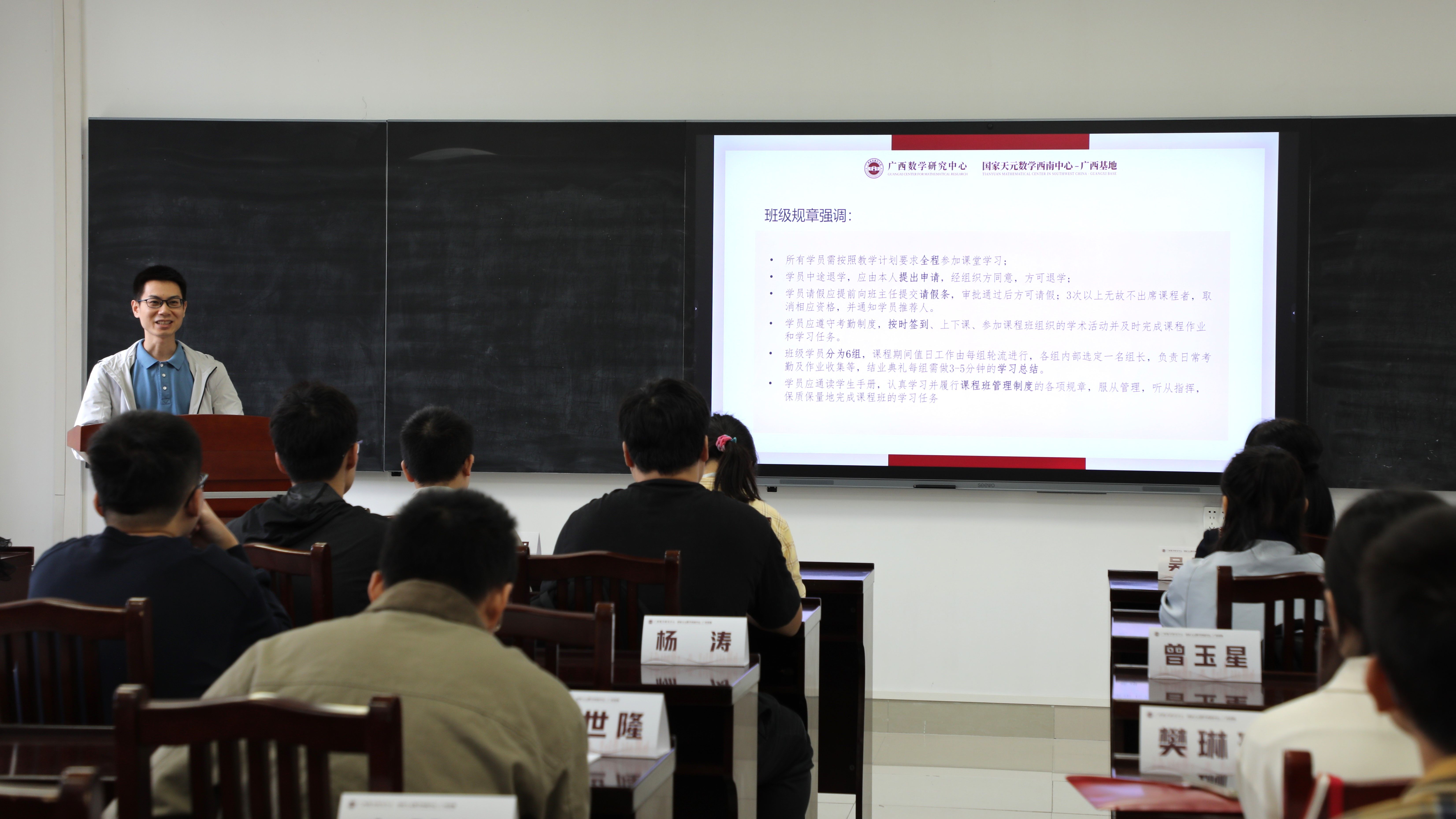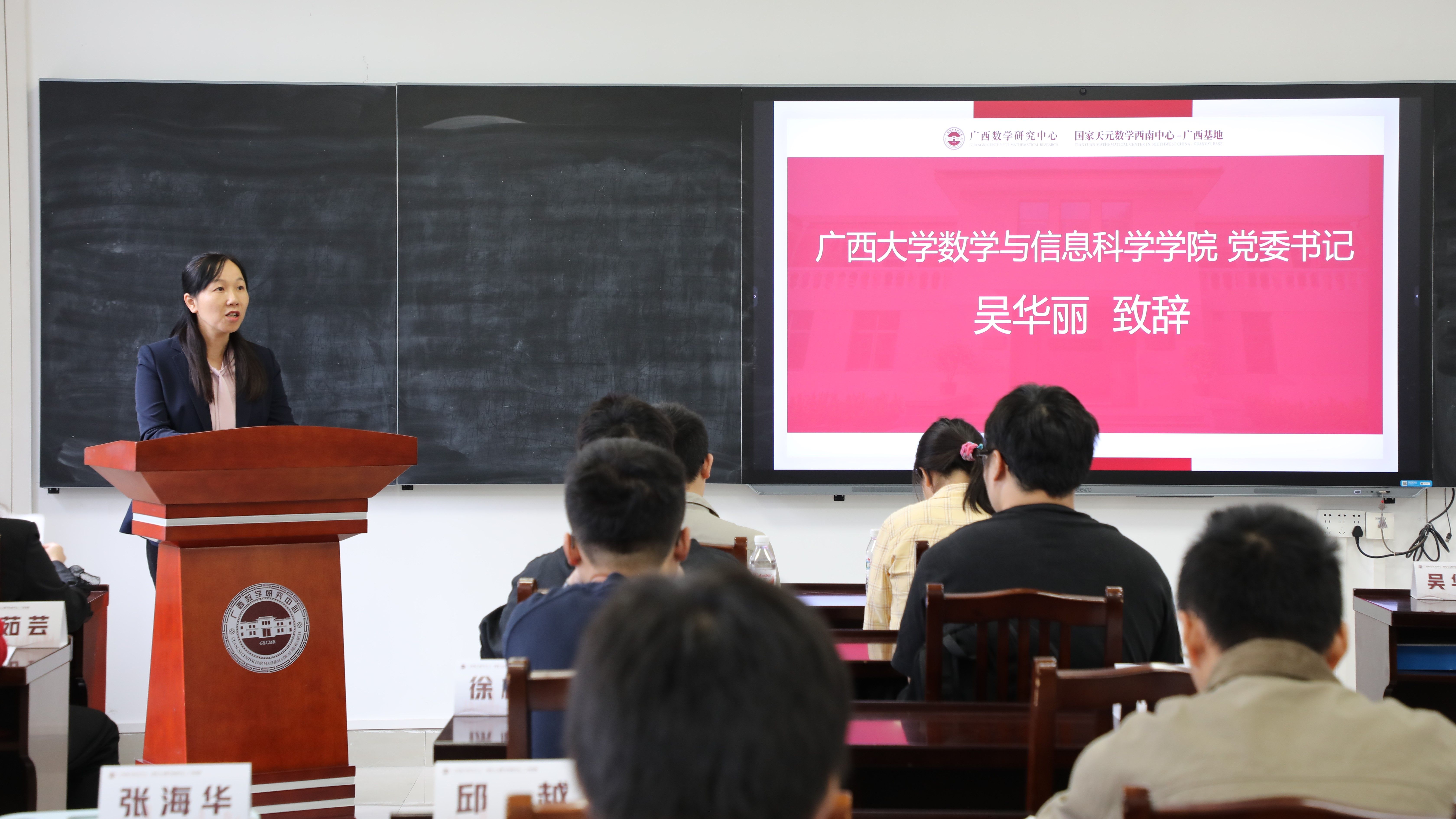 开班仪式由广西数学研究中心副主任谢非飞主持。广西大学数学与信息科学学院党委书记吴华丽出席开班仪式并致辞。她首先对全体学员和教师的到来表示诚挚的欢迎,并简要介绍广西大学数学学科的发展历程。希望学员们珍惜此次学习机会,积极思考、深入交流,将数学思维转化为解决实际问题的能力,期待大家在结业时,不仅能收获知识,增长见识,更能结交志同道合的伙伴,开启更新的科研合作历程。最后,祝愿本次课程班取得圆满成功。