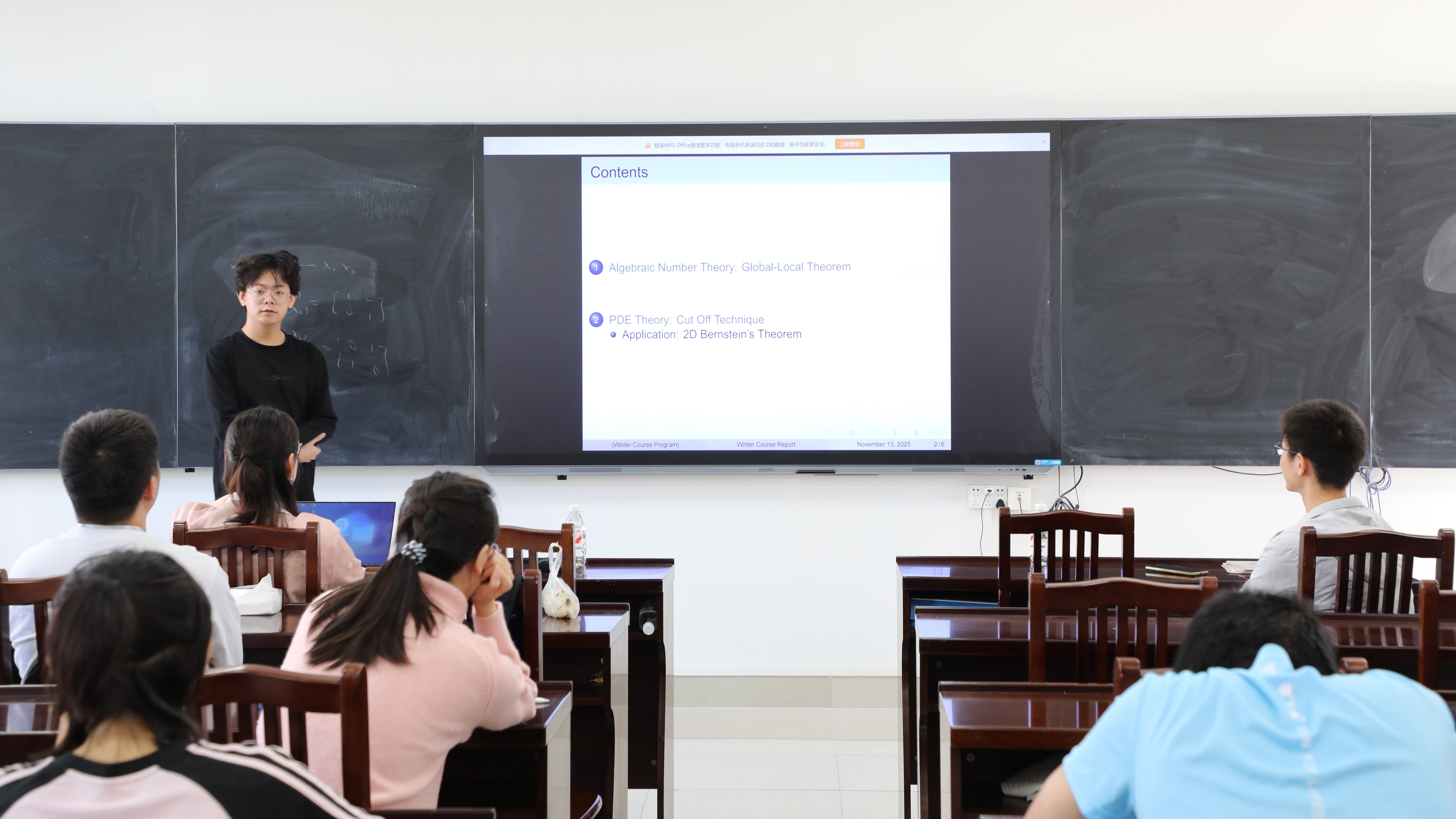 本次冬季课程历时两周,邀请到中山大学袁伟教授、首都师范大学沈伟明副教授与王越副教授、中国科学院数学与系统科学研究院数学研究所黄治中副研究员分别讲授《微分流形初步》、《二阶椭圆型偏微分方程基础》、《数论基础(II)》三门课程。诸位老师的精彩授课和不同风格皆受到广大学员好评,给同学们带来新的启迪和思考。课程班还分别邀请到广西大学何家维副教授、谭东副教授、高山泽副教授、刘楚萧助理教授、张旭俊助理教授等青年学者为学员们作专题报告。