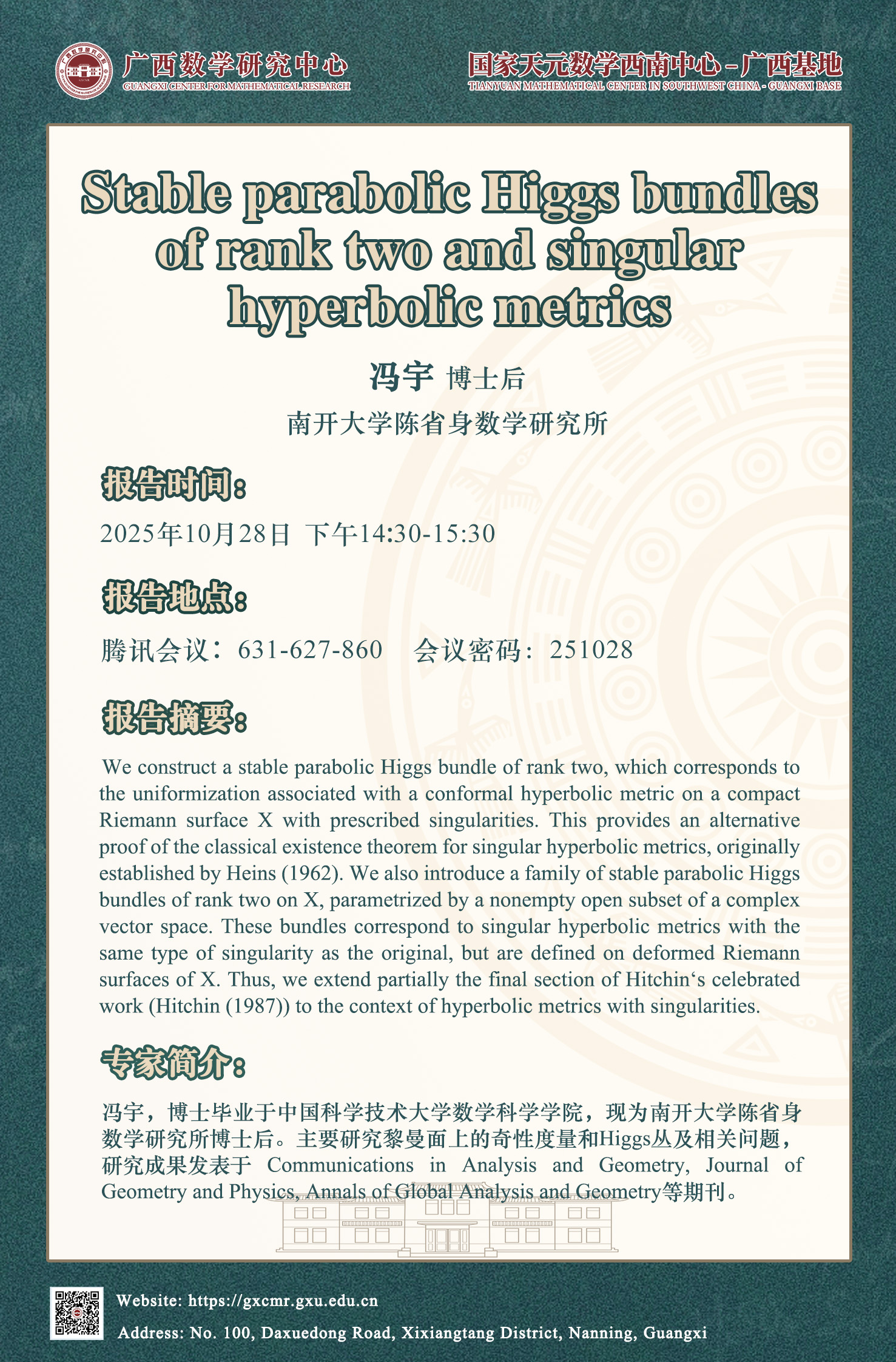 We construct a stable parabolic Higgs bundle of rank two, which corresponds to the uniformization associated with a conformal hyperbolic metric on a compact Riemann surface X with prescribed singularities. This provides an alternative proof of the classical existence theorem for singular hyperbolic metrics, originally established by Heins (1962). We also introduce a family of stable parabolic Higgs bundles of rank two on X, parametrized by a nonempty open subset of a complex vector space. These bundles correspond to singular hyperbolic metrics with the same type of singularity as the original, but are defined on deformed Riemann surfaces of X. Thus, we extend partially the final section of Hitchin‘s celebrated work (Hitchin (1987)) to the context of hyperbolic metrics with singularities.