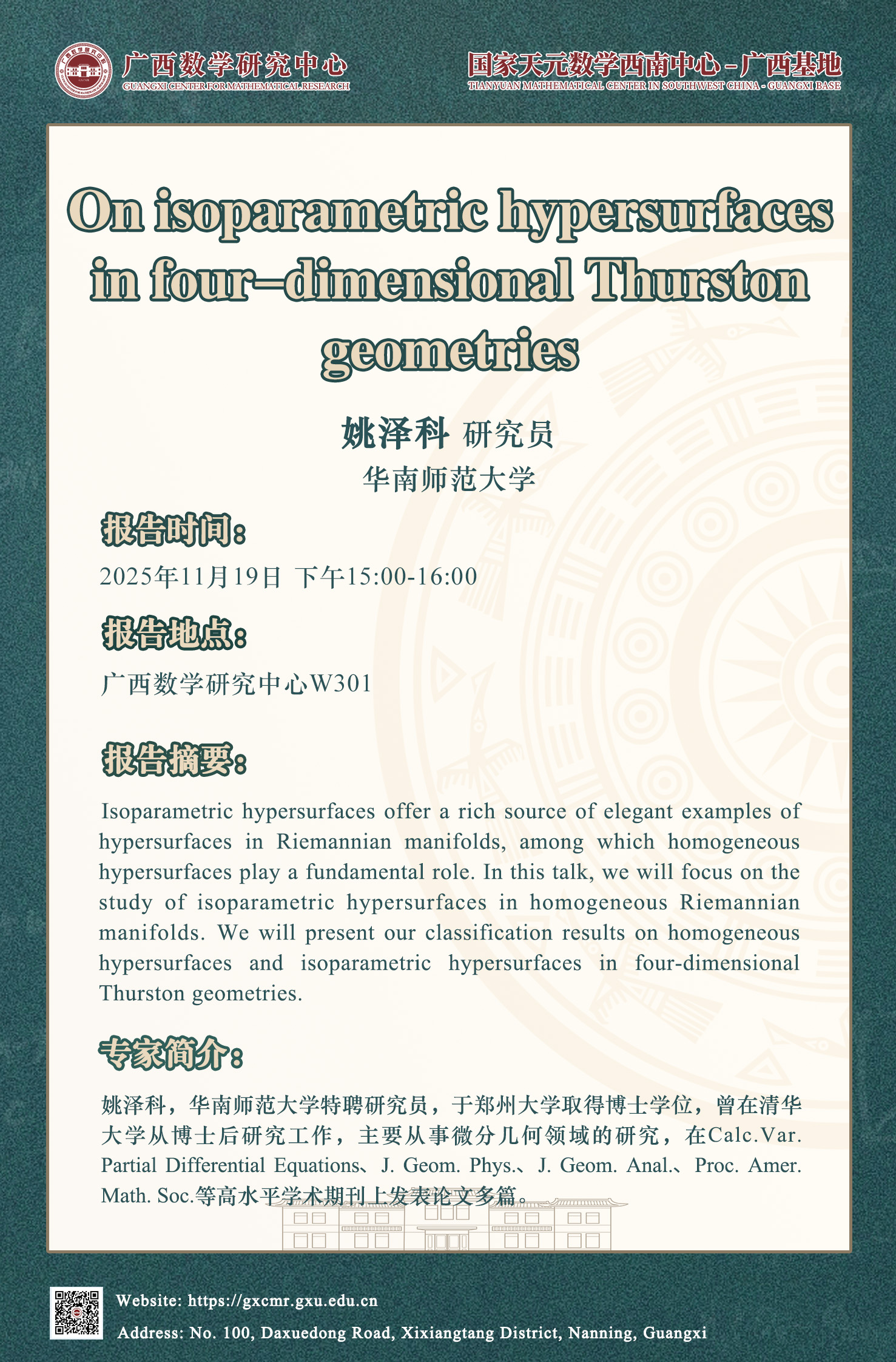 Isoparametric hypersurfaces offer a rich source of elegant examples of hypersurfaces in Riemannian manifolds, among which homogeneous hypersurfaces play a fundamental role. In this talk, we will focus on the study of isoparametric hypersurfaces in homogeneous Riemannian manifolds. We will present our classification results on homogeneous hypersurfaces and isoparametric hypersurfaces in four-dimensional Thurston geometries.