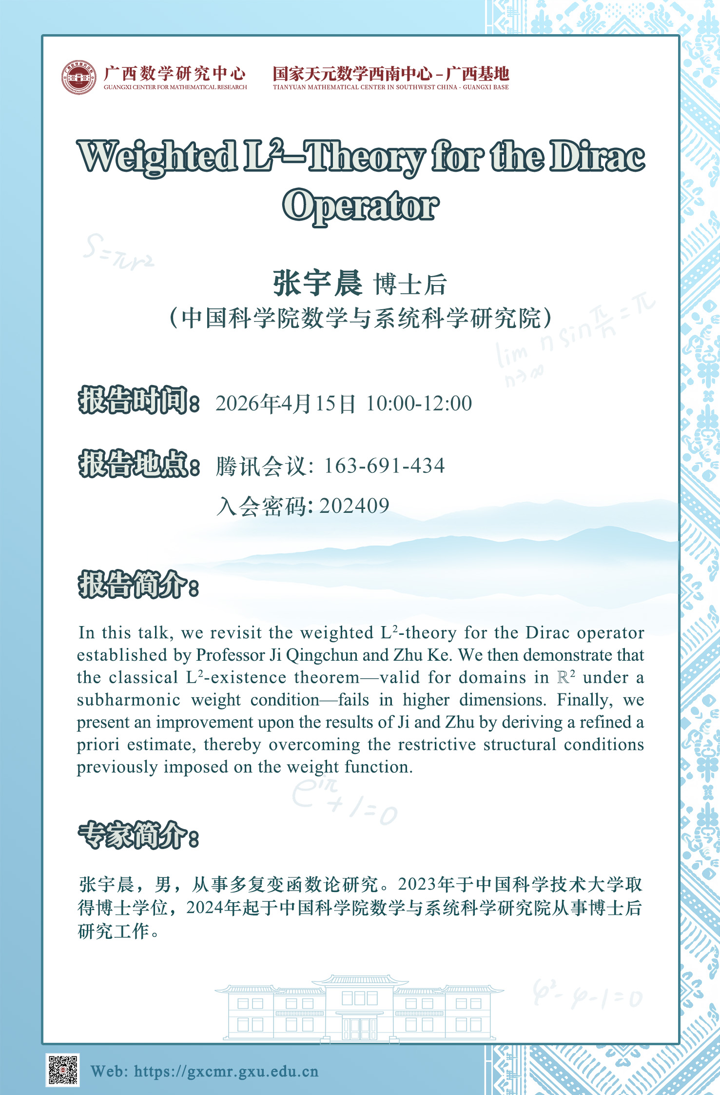 In this talk, we revisit the weighted L2-theory for the Dirac operator established by Professor Ji Qingchun and Zhu Ke. We then demonstrate that the classical L2-existence theorem—valid for domains in R2 under a subharmonic weight condition—fails in higher dimensions. Finally, we present an improvement upon the results of Ji and Zhu by deriving a refined a priori estimate, thereby overcoming the restrictive structural conditions previously imposed on the weight function.